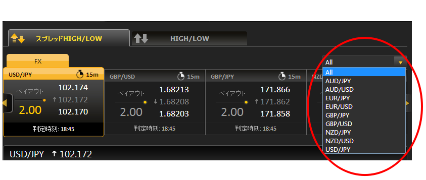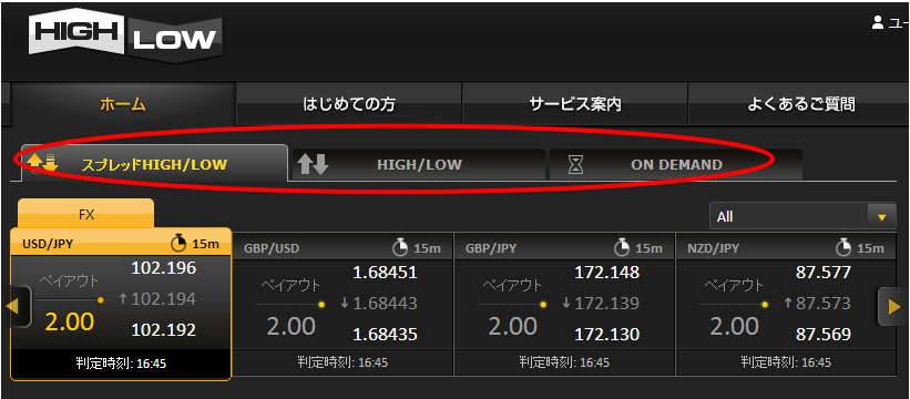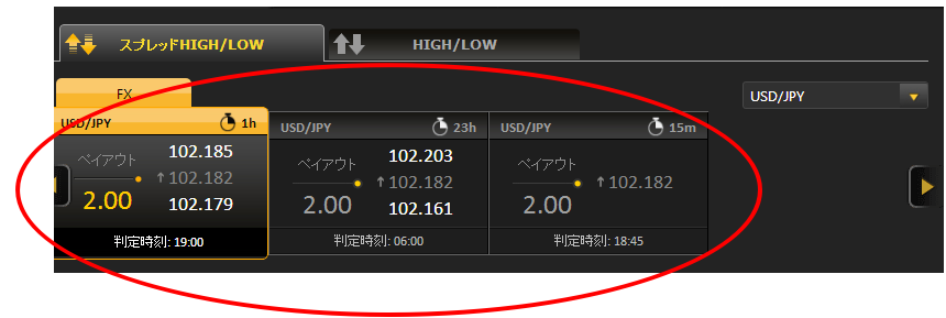 「スプレッドHIGHLOW」及び「HIGHLOW」を選択した場合、