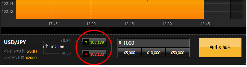 ※レンジ外値丁度の102.185円or102.179円で終わった場合、掛け金はそのまま戻ってきます。(引き分け扱い)