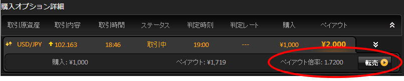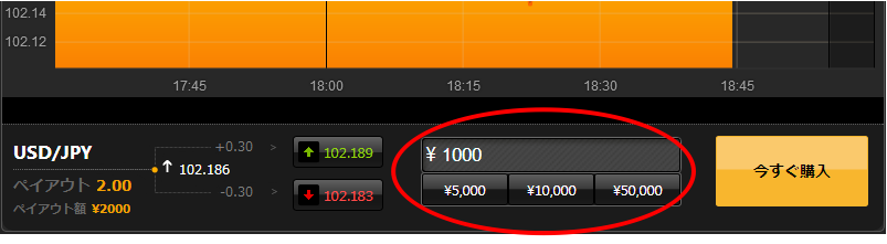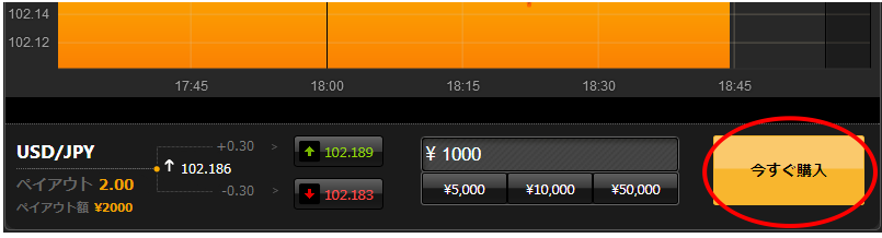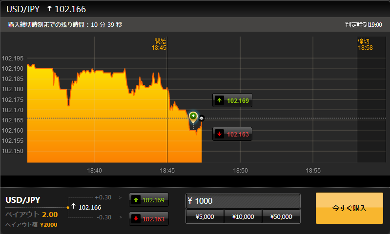 図の「1h」を例に取ると、現在値が102.182円で円安(↑)を予想した場合は、判定時刻である19:00に102.186円以上であれば、投資金が2倍になって払い出されます。