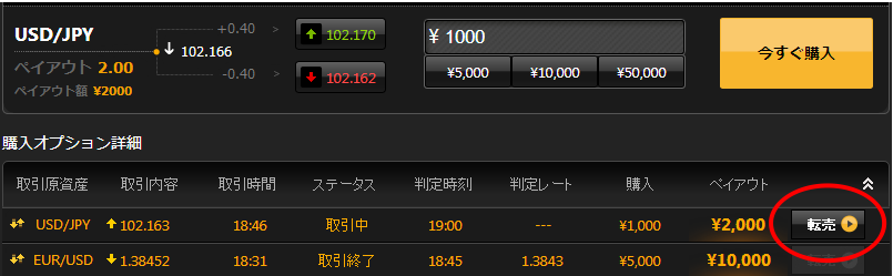 オーストラリアハイローでは、すべての取引で購入後「転売」することが可能です。